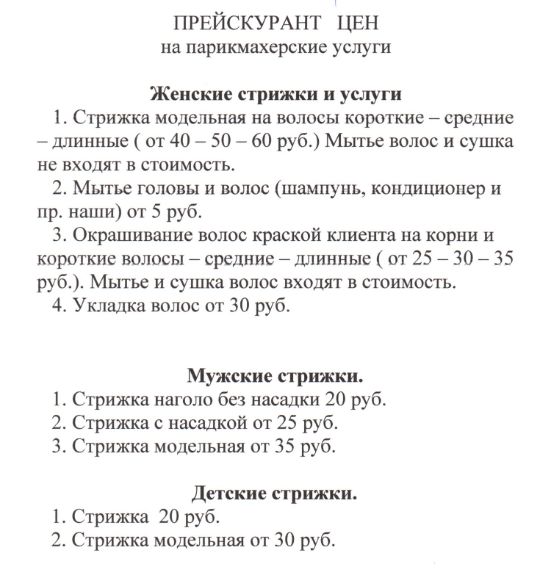 Прейскурант цен на парикмахерские услуги.